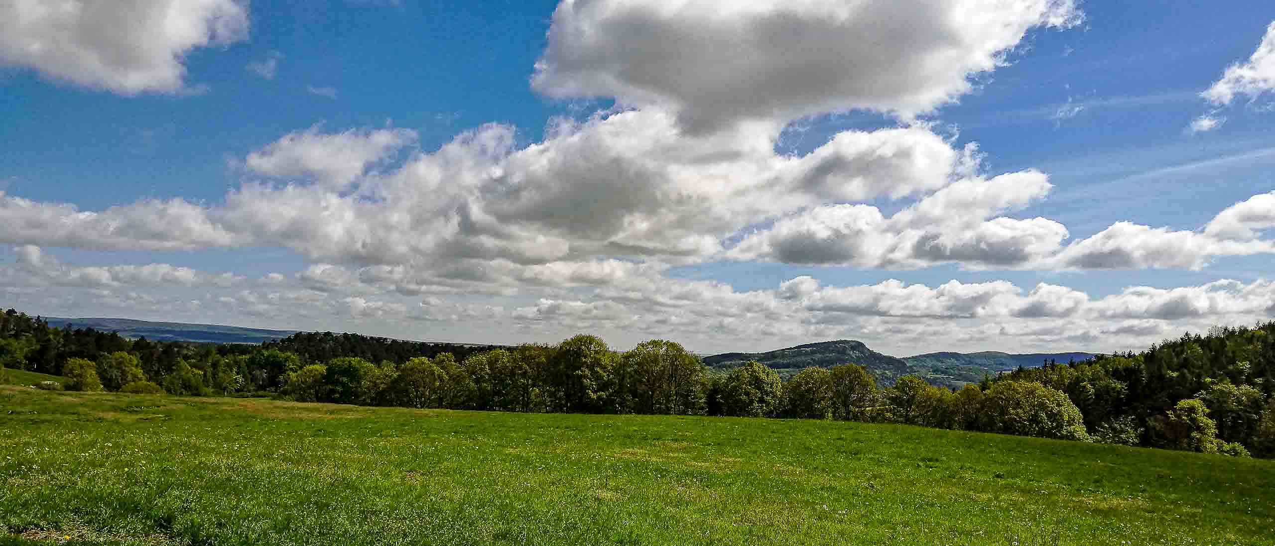 Vor uns liegen die sagenumwobenen Hörselberge. Unser Blick richtet sich auf den kleineren der beiden Berge. Beide sind seit jeher bekannt für zahlreiche Sagen und Geschichten. Frau Holle soll im Hörselberg wohnen und oft durchs Land ziehen. So manch einem hat sie schon Gutes, aber auch Schlechtes beschert. Ab und an soll auch das boshafte Gelächter des Teufels und das jämmerliche Geschrei der armen Seelen in der Hölle aus dem Berginneren zu vernehmen sein. Davon sei auch der Name „Hörselberg“ gekommen. – Höre der Seelen Berg! Übrigens wird erzählt, dass die Hörselberge die märchenhaftesten Berge in ganz Deutschland sind. Bei guter Sicht lässt sich von hieraus auch der Nationalpark Hainich entdecken. Liebevoll auch der „Urwald“ von Mitteleuropa genannt. Er ist mit 160 km² Fläche das größte zusammenhängende Laubwaldgebiet Deutschlands (vgl. Nationalpark Hainich).